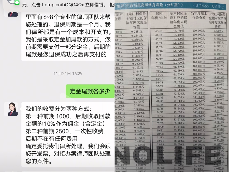 消费者葛女士购买的是一份20年期终身寿险,目前已缴费10年,近期因家庭原因急需用钱,她便萌生了退保的想法。在短视频平台搜索相关信息后,她很快被一名自称“专业处理各类退保”的钟姓律师私信联系。对方表示,只要签订委托协议,就可以对接一个由6至8名“专业律师”组成的案件群统一处理,退保周期约为一个月。收费方式分为两种:一是前期支付1000元定金,成功退保后再按回款金额的10%收取佣金;二是一次性支付2500元。该名“律师”还称,这份保单可以退还主险和长期险,附加的短期险则无法退还。