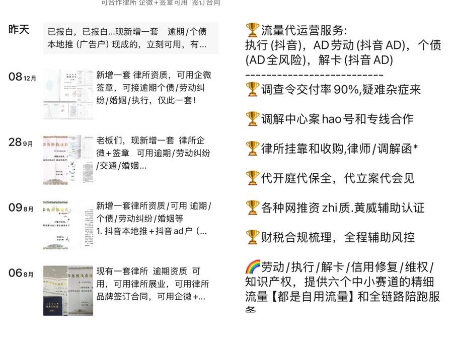 这也是为什么在短视频推广中,运营方必须租用律所资质进行认证。具备律所资质后,账号可以获得平台认可的律师认证标识,在公众面前营造专业可信的形象,同时让营销行为披上合法外衣。