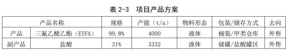 建设规模:建设一套4000吨/年三氟乙酸乙酯装置及其配套设施,三氟乙酸乙酯产能4000吨/年、副产31%盐酸3332吨/年。